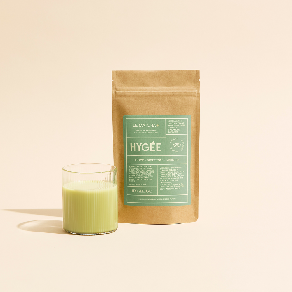 Ingrédients (pour 2,5g.) : poudre de matcha bio* (Camellia sinensis (L.) Kuntze, 1260 mg), fibre d'acacia bio*, extrait de maca bio* (Lepidium meyenii Walp., 250 mg), poudre de curcuma bio* (Curcuma longa L., 150 mg), poudre de cannelle bio* (Cinnamomum aromaticum, Cinnamomum loureiroi, 100 mg), poudre de gingembre bio* (Zingiber officinale Roscoe, 100 mg), poudre de cardamome bio* (Elettaria cardamomum (L.) Maton, 100 mg), extrait de lion's mane bio* (Hericium erinaceus (Bull.) Pers, 50 mg, sulfites), extrait de chaga bio* (Inonotus obliquus (Ach. ex Pers.) Pilat, 30 mg, sulfites), extrait de reishi bio* (Ganoderma lucidum, 20 mg, sulfites).
